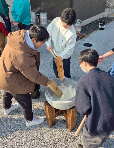 住民の方や別のボランティア団体の方々と一緒に餅つきを行いました。餅つきのやり方を一から丁寧に教えていただき,実際に体験することができてとても楽しかったです。お昼には,みんなで作った出来立ての餅をいただき,たくさん食べてお腹いっぱいになりました。ありがとうございました!